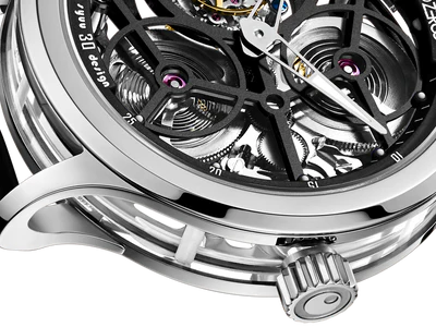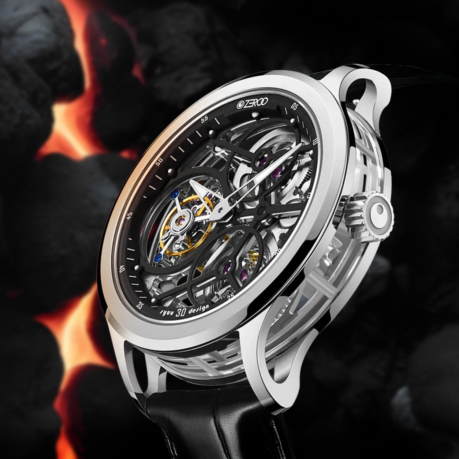 Das fliegende Tourbillon . Anders als ein traditionelles Tourbillon, das auf beiden Seiten von Brücken oder Klobenstrukturen getragen wird, ist das fliegende Tourbillon freitragend und wird nur von unten getragen. Dadurch entsteht die Illusion eines „schwebenden“ Mechanismus und wird optisch ansprechender, da es einen ungehinderten Blick auf die komplizierte Bewegung ermöglicht.
