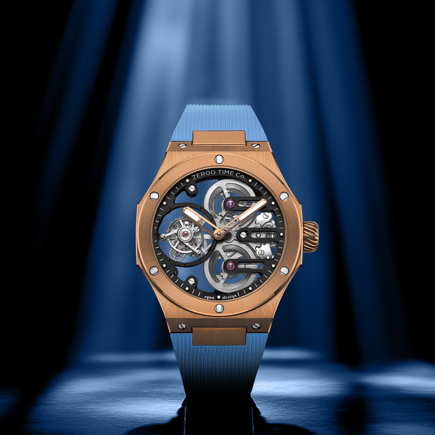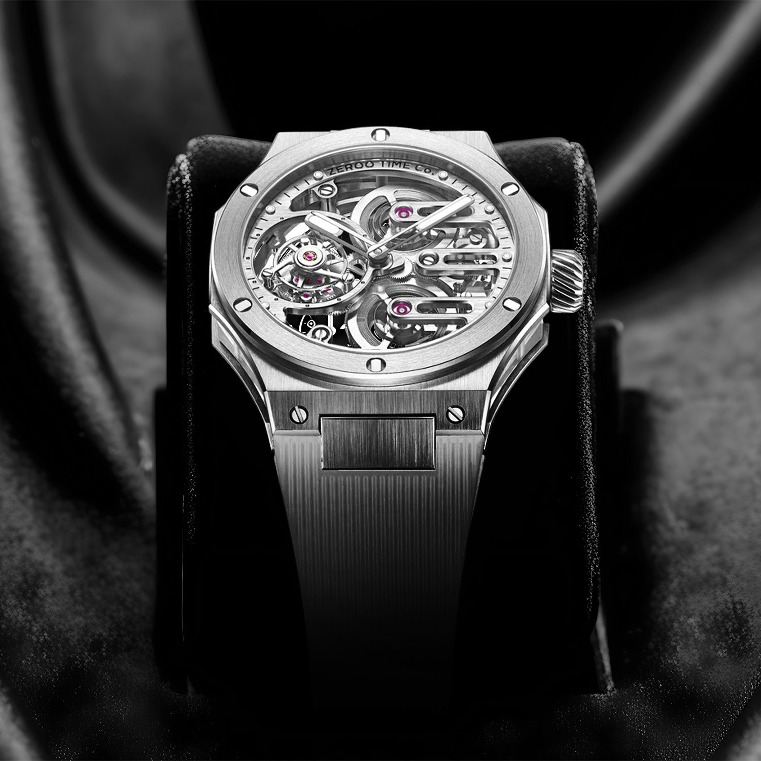 Die T8 ist Zeroos erste achteckige Uhr. Vollständig skelettiert, damit das Tourbillon optimal zur Geltung kommt.