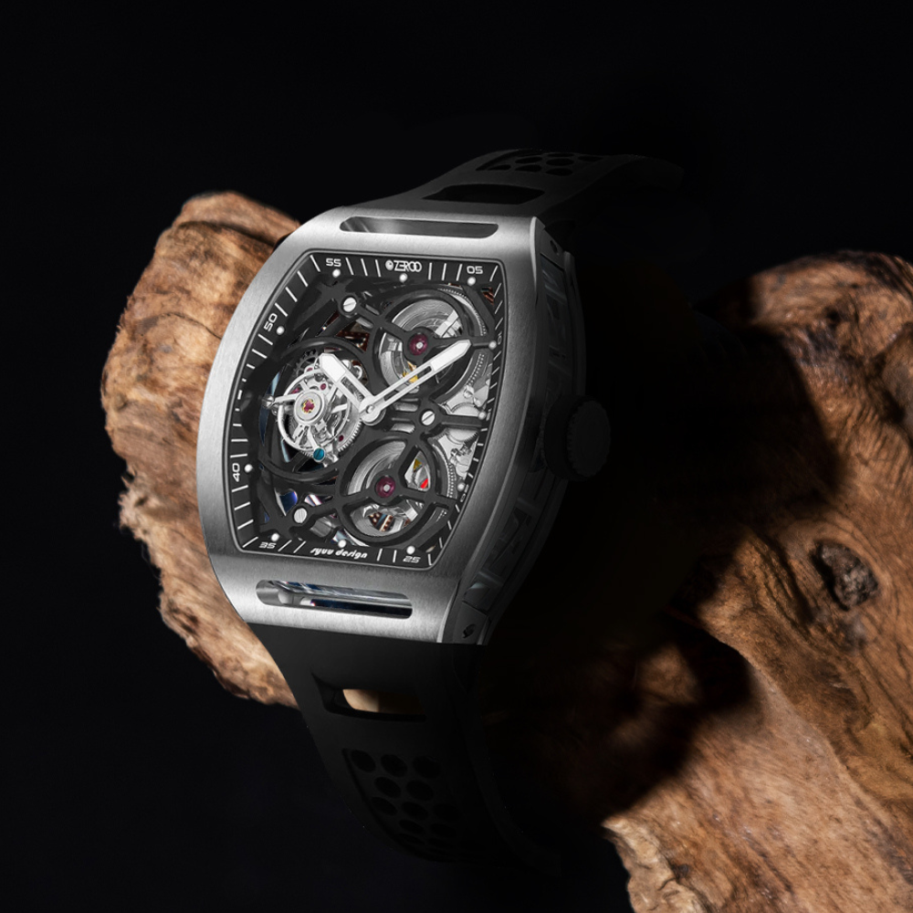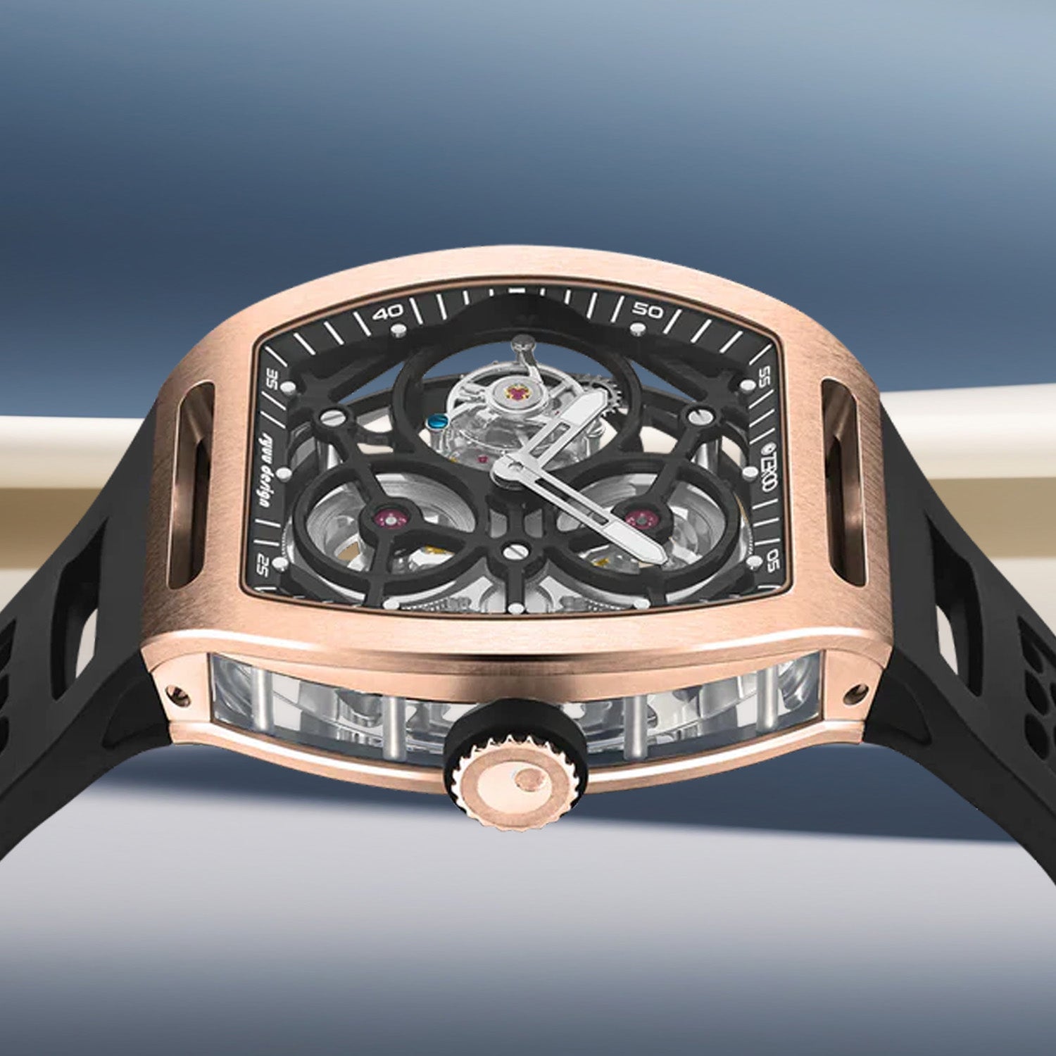 Ist ein Modell in limitierter Auflage von bis zu 1000 Stück pro Farbe. Dieses vollständig skelettierte, tonneauförmige Tourbillon ist transparent gestaltet, sodass der Träger die Präzision des fliegenden Tourbillon-Uhrwerks nicht nur von vorne und hinten, sondern auch von den Seiten bewundern kann.